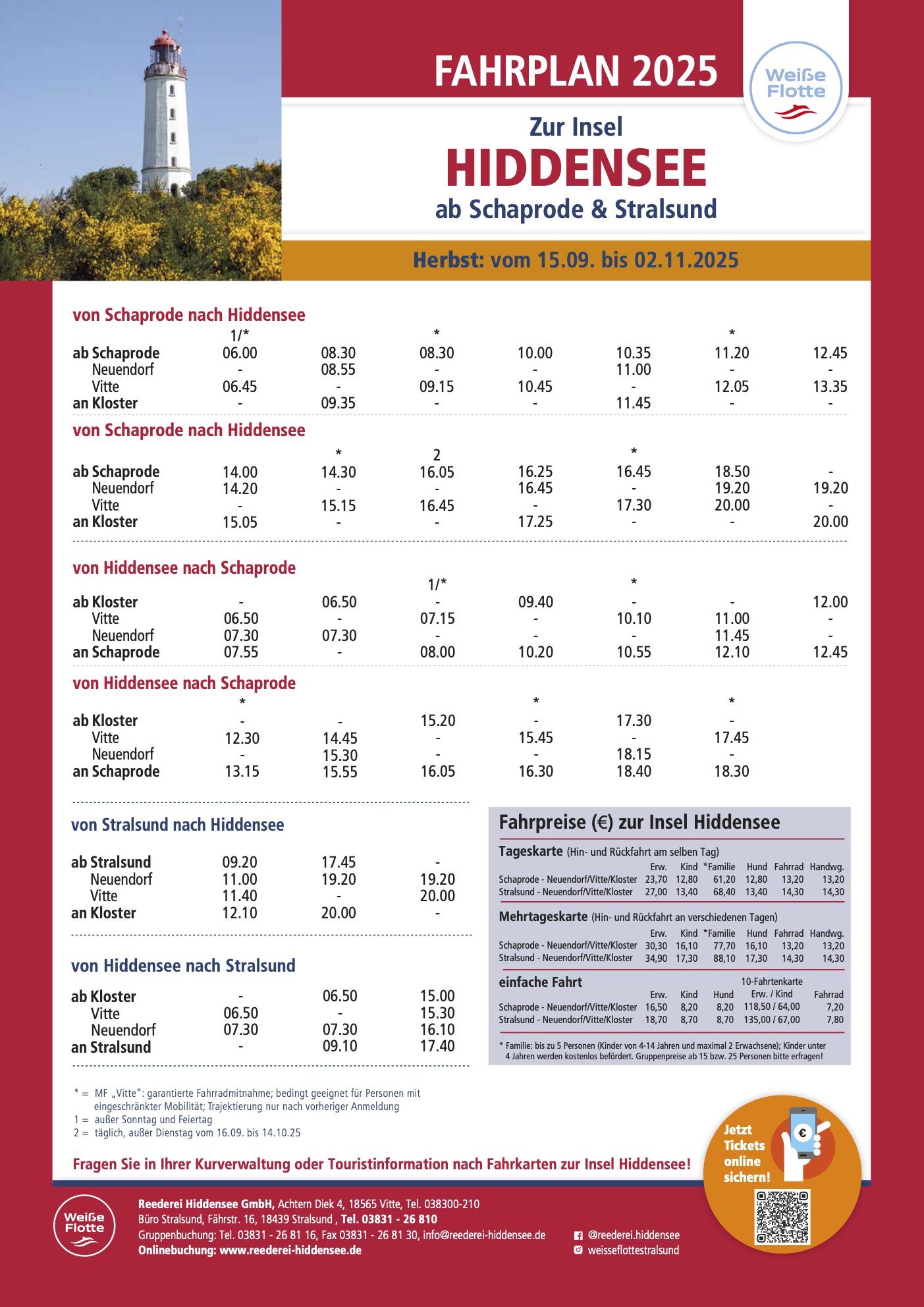 Auf dieser Seite finden Sie die aktuellen Fahrpläne der Reederei Hiddensee, sowie den Fahrplan unseres Inselbusses.