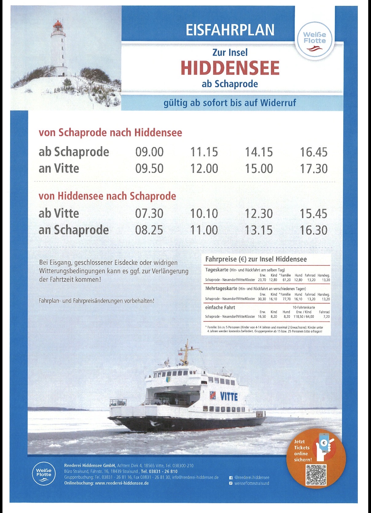 Wir weisen darauf hin, dass auf der Insel Hiddensee Kurabgabepflicht besteht. Die Kurabgabe wird zusammen mit der Reservierung oder bei der Ticketausgabe vor Ort am Fahrkartenschalter in den Häfen entrichtet. Der Erwerb der Kurkarte am Fahrkartenschalter ersetzt nicht die Reservierung. Tickets sind in diesem Fall nur noch nach Verfügbarkeit erhältlich. Eine Reservierung wird daher dringend empfohlen!