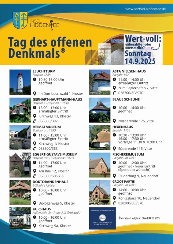 Am Sonntag den 14.09.2025 öffnen sich erneut die Türen zu historischer Pracht und kulturellem Erbe – der Tag des offenen Denkmals auf der zauberhaften Insel Hiddensee steht vor der Tür! Tauchen Sie ein in die faszinierende Geschichte dieser einzigartigen Insel und lassen Sie sich von den Geschichten und Geheimnissen unserer denkmalgeschützten Orte verzaubern.