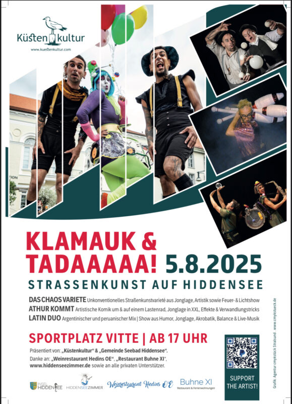 Am 5. August 2025 verwandelt sich Hiddensee in eine Bühne für Straßenkunst der Extraklasse! Unter dem Motto „Klamauk & Tadaaaaa!“ präsentiert „Küstenkultur“ in Zusammenarbeit mit der Gemeinde Seebad Hiddensee ein unvergessliches Straßentheaterfestival auf dem Sportplatz Vitte (ab 17 Uhr).Freuen Sie sich auf „Das Chaos Variete“, eine unkonventionelle Show mit Jonglage und Artistik. Außerdem wird „Athur kommt“ mit artistischer Komik auf einem Lastenrad, Jonglage in XXL und unglaublichen Verwandlungstricks für Staunen sorgen. Das „Latin Duo“ begeistert mit einem Mix aus Humor, Jonglage, Akrobatik, Balance und Live-Musik. Ein vielfältiges Programm für die ganze Familie! Möglich gemacht wird dieses Event durch die Unterstützung von „Weinrestaurant Hedins OE“, „Restaurant Buhne XI“ und vielen privaten Unterstützern. Seien Sie dabei und unterstützen Sie die Künstler!
