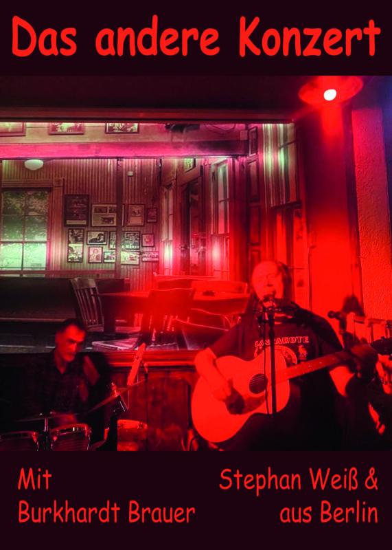 Stephan Weiß aus Berlin, der heimliche Hauptmann von Köpenick, Liedermacher und Kabarettist, spielt „Andere Berliner Lieder“, mal laut ironisch, mal nachdenklich romantisch, manchmal zum Mitsummen und Mitsingen, meistens wie „am Lagerfeuer“. Begleitet wird er von Burkhardt Brauer/ Percussion aus dem Berliner Prenzlauer Berg, der in seinem ersten Leben Techniker u.a. bei Maischberger, Sportstudio, Verstehen Sie Spaß? oder Hart aber fair ist, dazu von der Westerngitarre und Bluesmundharmonika oder bei besonders guter Laune auch mal von einer Trompete, Tröte, Triangel oder Geige….begleitet